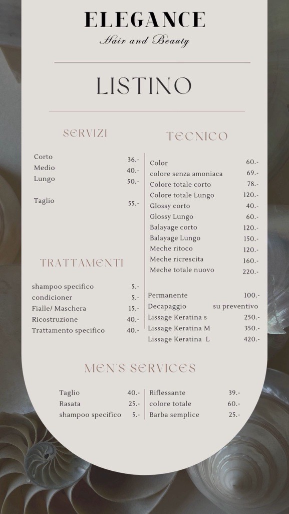 Benvenuti da Elegance Hair and Beauty, il vostro salone di fiducia nel cuore di Lugano. Da oltre 20 anni, uniamo estetica, professionalità e benessere in un ambiente elegante e accogliente. Offriamo trattamenti per lui, per lei e per i più piccoli, con un approccio su misura e tecnologie all'avanguardia. Il nostro team vanta oltre 30 anni di esperienza nel settore estetico e si prende cura della bellezza di ogni cliente con passione e competenza.